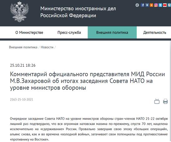 俄罗斯外交部官网10月25日发布声明,对北约防长会的结果进行评论。俄外交部发言人扎哈罗娃表示,北约防长会再次证实,整个北约的庞大机制在70年后依然以专门遏制俄罗斯为目标。“对手”一词已经牢牢扎根在北约的词典里,这是该联盟重返冷战时期的另一佐证。