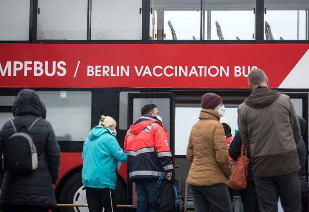 当地时间2021年11月17日,德国柏林,人们在大巴前排队接种新冠疫苗。图源:视觉中国