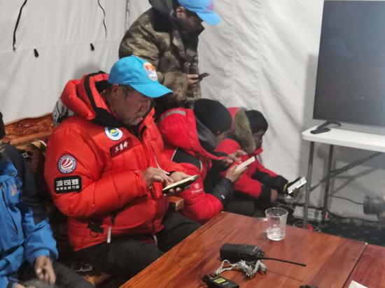 中国登山队队长王勇峰正在与准备冲顶的队员进行视频联络。人民日报记者袁泉、谷业凯摄