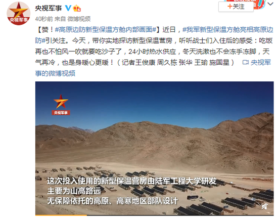 近日,我军新型保温方舱亮相高原边防引关注。今天,带你实地探访新型保温营房,听听战士们入住后的感受:吃饭再也不怕风一吹就要吃沙子了,24小时热水供应,冬天洗漱也不会冻手冻脚,天气再冷,也是身暖心更暖!(记者王俊康 周久栋 张华 王瑜 施国星)