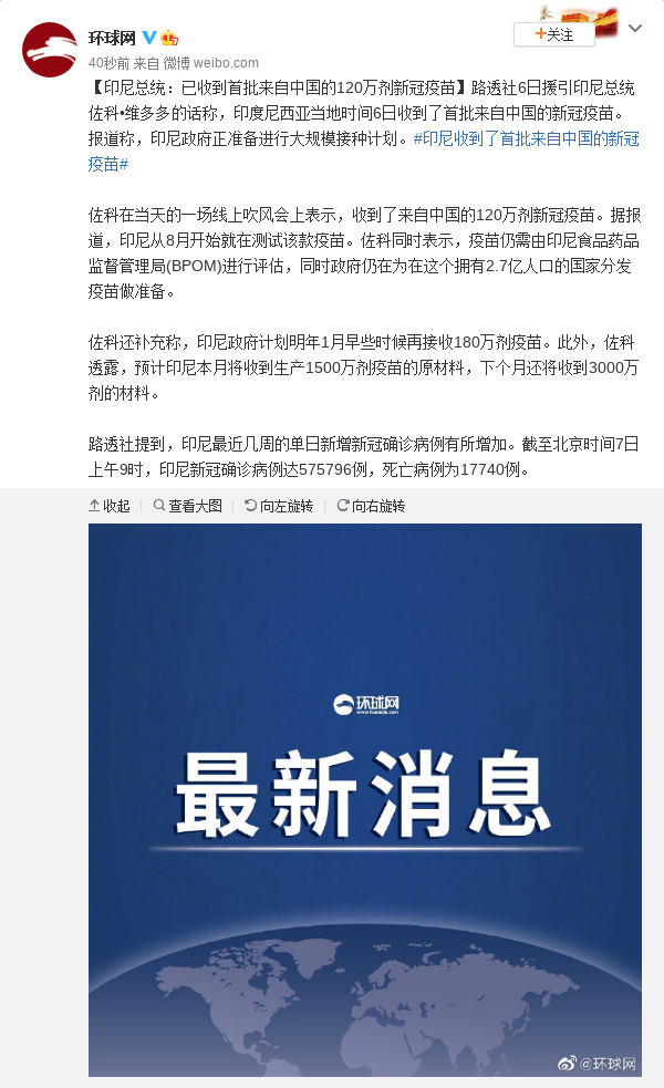 印尼总统:已收到首批来自中国的120万剂新冠疫苗
