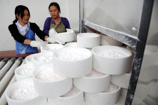 资料图:江西省赣州市信丰县包钢新利稀土公司工人在灼烧车间搬运灼烧后的氧化钇(新华社)