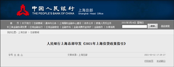 中国人民银行上海总部网站消息,为贯彻落实2021年人民银行信贷政策各项要求和重点任务,近日,人民银行上海总部结合上海实际,制定印发了《2021年上海信贷政策指引》(以下简称《指引》),围绕加强小微民营企业金融服务、落实房地产调控措施、支持重点产业和重点区域发展、推进城乡融合与乡村振兴、做好薄弱环节和重点领域金融服务等重点任务,提出16个方面具体工作指引,引导辖内金融机构进一步优化信贷结构,切实增强服务实体经济能力。