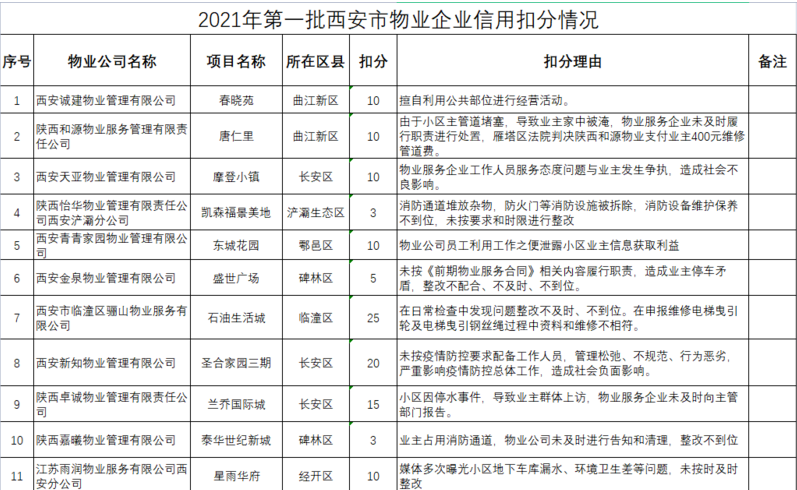 然而近年来物业服务纠纷逐渐增多,针对物业管理的投诉与维权也是屡见不鲜。日前西安市住建局官网公布了2021年第一批物业企业信用扣分情况,共有11家企业因违规行为扣分。