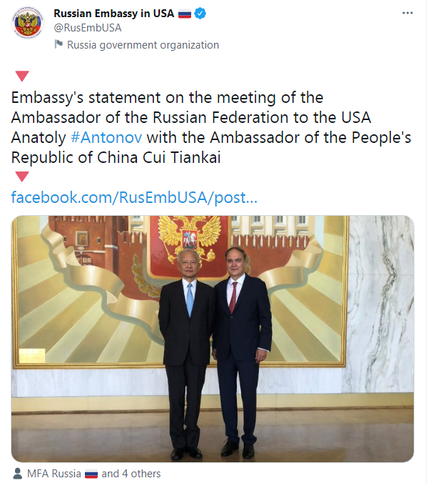 就在崔天凯发表辞别信当天,他去了趟俄罗斯驻美大使馆,同俄驻美大使安东诺夫畅聊了一番。俄驻美使馆在其推特上发布了两位大使的合影,并发布声明称:“外交使团的负责人们支持发展两国间战略伙伴关系,以及俄罗斯和中国驻华盛顿大使馆之间的友好关系。”声明还说道:“安东诺夫大使向同仁介绍了6月16日在日内瓦举行的俄美首脑峰会的情况。”