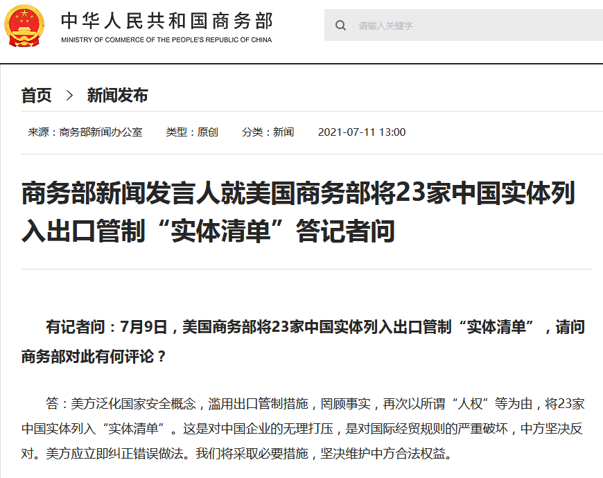 近日,美国商务部将23家中国实体列入出口管制“实体清单”的消息引发关注。对此,我国商务部发言人回应称,这是对中国企业的无理打压,是对国际经贸规则的严重破坏,中方坚决反对。美方应立即纠正错误做法。我们将采取必要措施,坚决维护中方合法权益。