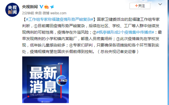国家卫健委派出的赴福建工作组专家判断,①目前莆田疫情形势严峻复杂,后续在社区、学校、工厂等人群中继续发现病例的可能性高,疫情存在外溢风险;②枫亭镇形成2个疫情集中传播点:最早发现病例的小学和镇内某鞋厂,都是人员密集场所;③此次疫情首先在学校发现,低年龄儿童感染较多;④专家们研判,只要确保各项措施和各个环节落到实处,疫情规模有望在国庆长假前得到控制。(总台央视记者史迎春)