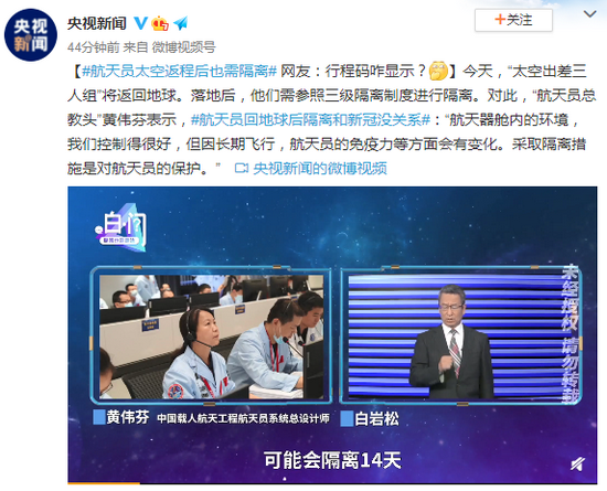 今天,“太空出差三人组”将返回地球。落地后,他们需参照三级隔离制度进行隔离。对此,“航天员总教头”黄伟芬表示,#航天员回地球后隔离和新冠没关系#:“航天器舱内的环境,我们控制得很好,但因长期飞行,航天员的免疫力等方面会有变化。采取隔离措施是对航天员的保护。”
