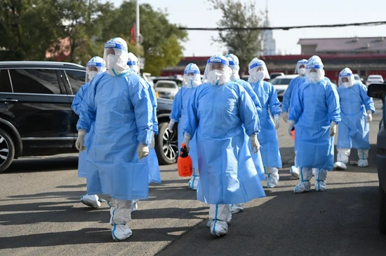 10月23日,内蒙古自治区呼和浩特市,医护人员步入确诊病例曾居住的小区。