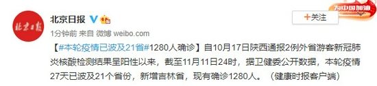 自10月17日陕西通报2例外省游客新冠肺炎核酸检测结果呈阳性以来,截至11月11日24时,据卫健委公开数据,本轮疫情27天已波及21个省份,新增吉林省,现有确诊1280人。(健康时报客户端)