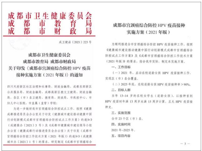 11月15日,成都市卫健委联合市教育局、市财政局正式下发了《成都市宫颈癌综合防控HPV疫苗接种实施方案(2021年版)》。方案提出,从2021年起启动全市在校适龄女孩HPV疫苗接种工作,实现区(市)县全覆盖;计划到2025年底,达到在校适龄女孩HPV接种率>90%的目标。