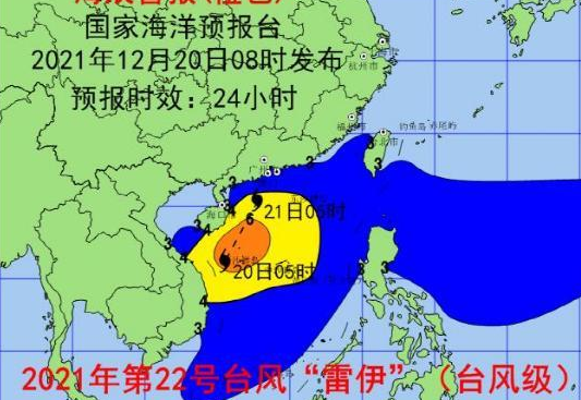 受今年第22号台风“雷伊”(台风级)和冷空气的共同影响,预计12月20日中午到21日中午,南海西部将出现5到8米的巨浪到狂浪区,近海海域海浪预警级别为黄色;海南东部、南部近岸海域将出现3到4.5米的大浪到巨浪,该近岸海域海浪预警级别为橙色;广东近岸海域将出现2到3.4米的中浪到大浪,该近岸海域海浪预警级别为蓝色。