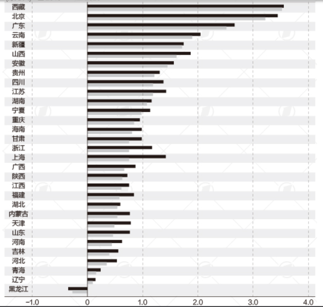 人均累计结余是可以反映当前养老保险基金抗风险能力的指标,也反映了近一段时间以来养老保险基金多年累计运行情况。报告显示,基金结余额地区间差异明显,东北三省和青海、河北、河南、山东、天津城镇职工基本养老保险基金人均累计结余不超过5000元/人,其中,黑龙江人均累计结余为负数。广东、北京和西藏人均累计结余超过2.5万元/人。