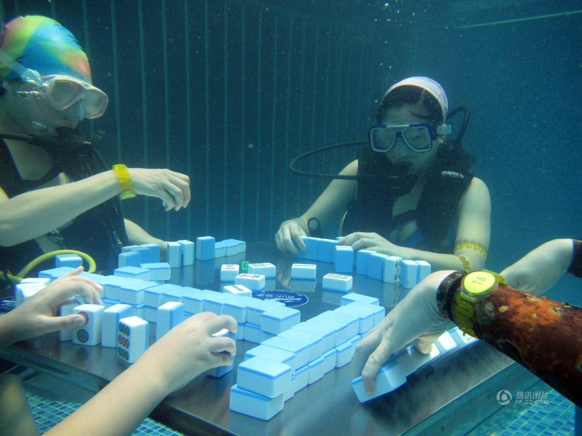 7月17日,连续多日的高温让重庆主城开启了烧烤模式,为求清凉,在渝北北部新区大竹林江与城体育公园里,爱好潜水的麻友们为求清凉,竟将麻将桌搬到了水下,打起了“血战到底”的成都麻将。