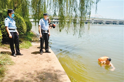 为了避免发生意外,民警劝阻市民不要在河水中游泳。 记者 王涛 摄