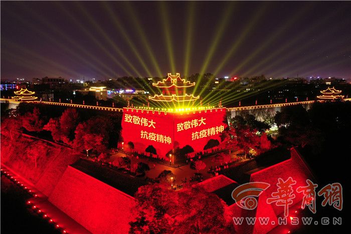 为致敬伟大抗疫精神,昨晚,西安市大唐不夜城、东南城角、高新区等地及延安市多处大屏开展“点亮伟大抗疫精神”活动,璀璨灯幕打出“致敬国家英雄 致敬人民英雄 致敬抗疫英雄”“生命至上 举国同心舍生忘死 尊重科学 命运与共”等一句句振奋人心的话语,不少商城、酒店的大屏上也亮起了致敬画面,滚动标语格外醒目,远远望去激动人心,令人振奋!向抗疫英雄致敬,为中国加油! 华商报记者 张杰 王健 陈团结 赵彬 摄
