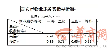 物业服务收费依据物业服务等级按照高层、多层收取。物业服务等级标准依据西安市住建局印发的《西安市普通住宅小区物业服务指导标准》,按质价相符的原则制定,物业服务达不到三级服务标准的按等外标准收取;高层指七层以上(含七层)带电梯的住宅,七层不带电梯的参照多层收费标准;多层指六层以下(含六层)不带电梯的住宅,六层及以下带电梯的参照高层收费标准。高层一级物业费为2.2元/平方米·月,多层一级物业费0.85元/平方米·月,与现行基础物业费、公摊电费、电梯费分项收取相比较,按平均值测算(公摊电费0.18元/平米•月、电梯费0.32元/平米•月),高层住宅物业费平均涨幅7.2%,多层住宅物业费平均涨幅18.5%。