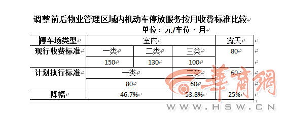物业管理区域机动车停放服务费根据停车场类型,按月收费,室内一类80元/车位·月,二类60元/车位·月,露天60元/车位·月。按次计费不分昼夜,连续停车每4小时为一次,室内一类2.5元/车位·次,二类2元/车位·次,露天2元/车位·次。