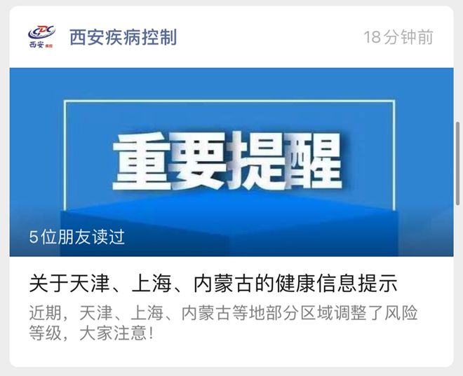 一、请市民密切关注天津市、上海市、内蒙古自治区发布的确诊病例和无症状感染者行动轨迹。现居住西安且与天津市、上海市及内蒙古自治区确诊病例、无症状感染者行程轨迹有交集,特别是11月7日以来,天津市滨海新区东疆港区(含瞰海轩小区)、汉沽街、中心渔港冷链物流区A区和B区;上海市浦东新区祝桥镇营前村、新生小区、周浦镇明天华城小区、张江镇顺和路126弄小区的来返人员;内蒙古呼伦贝尔市满州里市东山街道、北区街道的来返人员,请主动向所在社区报备相关活动情况,配合各区县(开发区)疫情防控指挥部落实集中隔离等疫情防控措施,在管控当天和第13天各进行一次核酸检测。