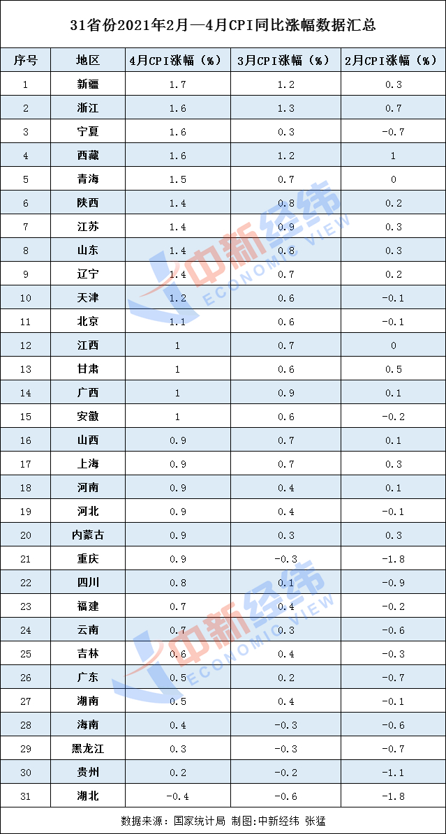 山西、上海、河南、河北、内蒙古、重庆等6省份涨幅与全国持平。新疆、浙江、宁夏、西藏、青海、陕西、江苏、山东、辽宁、天津、北京、江西、甘肃、广西、安徽等15个省份4月份CPI同比涨幅略高于全国平均水平。