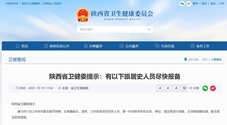 请10月1日以来有内蒙古额济纳旗,甘肃嘉峪关、酒泉、兰州旅居史的在陕人员,第一时间联系所在社区、单位、酒店等进行报备,主动做核酸检测,配合落实防控措施。
