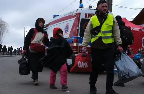 ▲2月28日,一名志愿者陪同来自乌克兰的人们离开波兰梅迪卡口岸。图/新华社