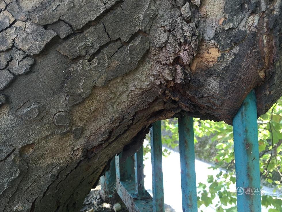 这棵“树坚强”胸径约半米,树干穿过路边护栏,其中3根栏杆又穿透树干,已“长”进了树干里,大树却似乎没有受到任何影响。