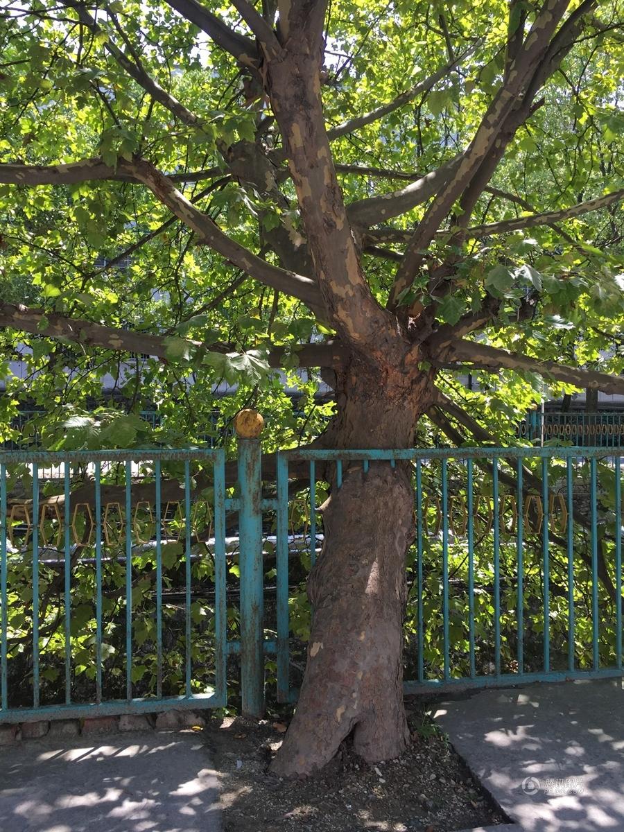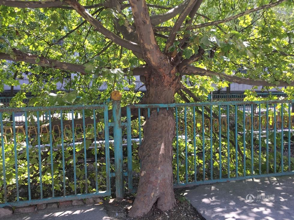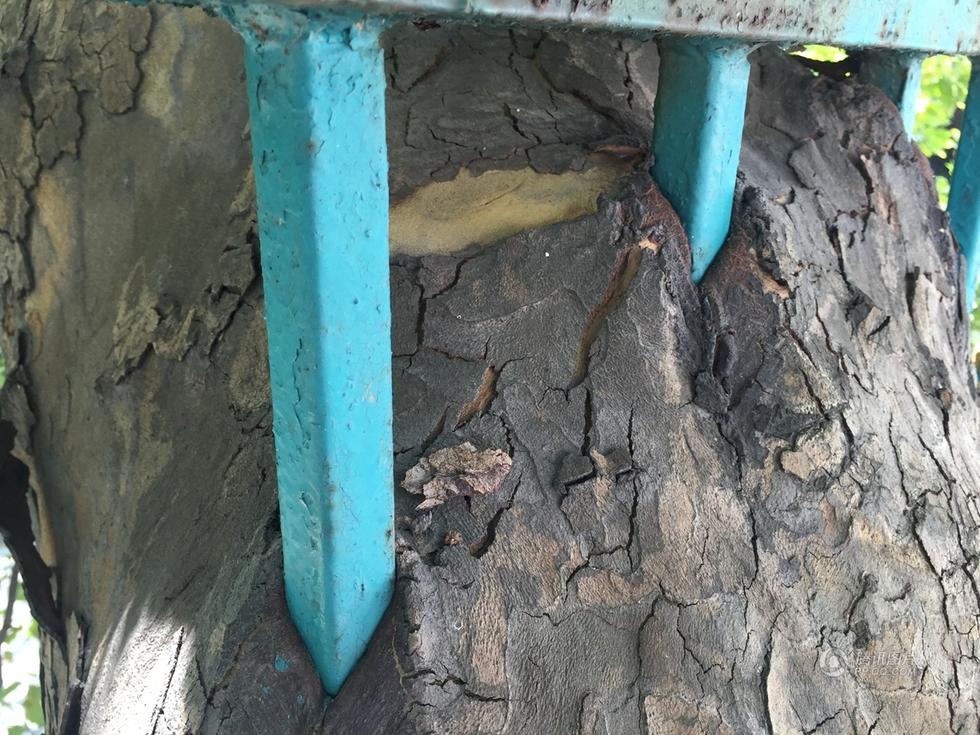 没想到这棵树长得特别快,树干越来越粗,陆续就将三根栏杆“吞”了进去。