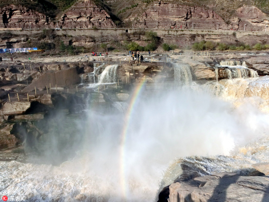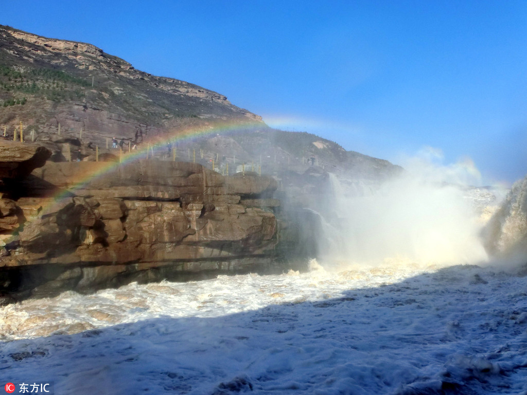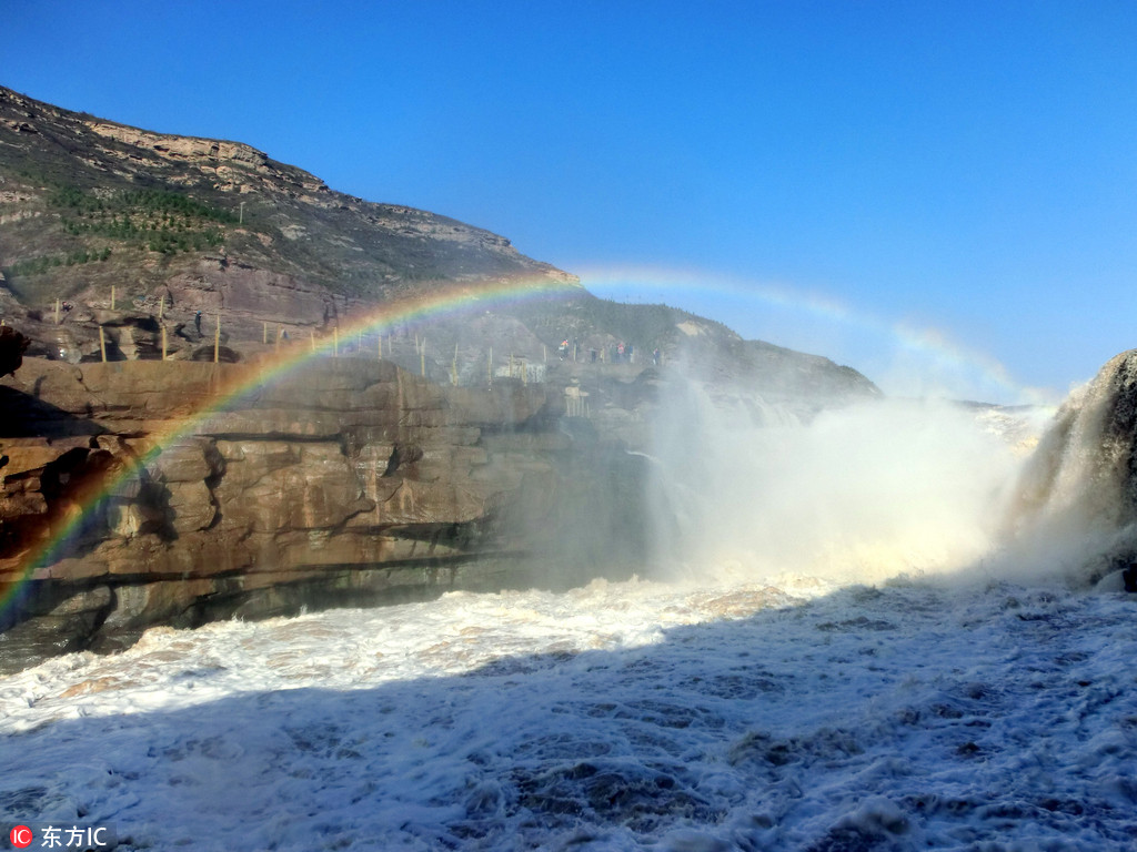 2016年10月31日,位于晋陕大峡谷的黄河壶口瀑布,晴空万里,彩虹当空,与急流湍急的瀑布交相辉映,壮观美丽。 王辉耀/东方IC
