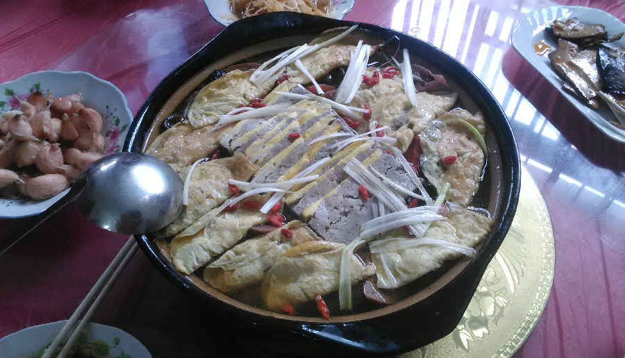 来到田梁农家(CCTV《远方的家》拍摄点)农家乐用午餐,品尝了特色菜“蒸盆子”。真有点像广东名菜“佛跳墙”呢。