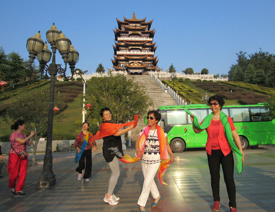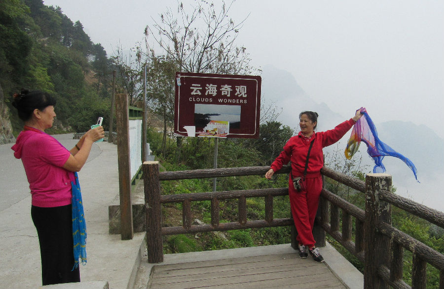 21日清晨,我们沿汉旋公路抵达凤凰山顶部,准备在这里看云海。但是当天云雾较大,我们只好等待最精彩的云海奇观。等待之时,大家利用播放器播出的音乐,在停车场开始舞动彩绸,扭起了秧歌。