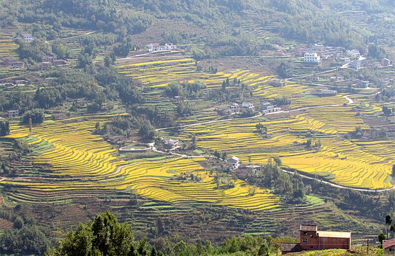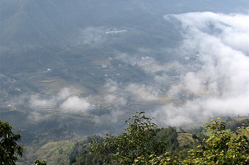没等白云散去,大家已经下到山谷底部,展现在眼前的,是白云下面层层的梯田,梯田里的晚稻尚未收割,金黄的稻田弯弯曲曲、层层叠叠,加上旁边白色的农家房舍、绿树红叶,一片美丽的山乡景色让大家陶醉其中。