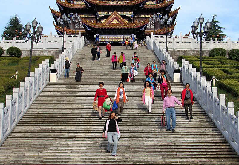 第二天风和日丽。旅行团全体人员乘车登上美丽的凤凰山,他们很幸运地看到了万里云海。从汉江流域产生的水汽形成棉絮般的浮云,漂浮在山谷里,大家站在观景台放眼望去,脚下不远处就是一眼望不到边的白云。