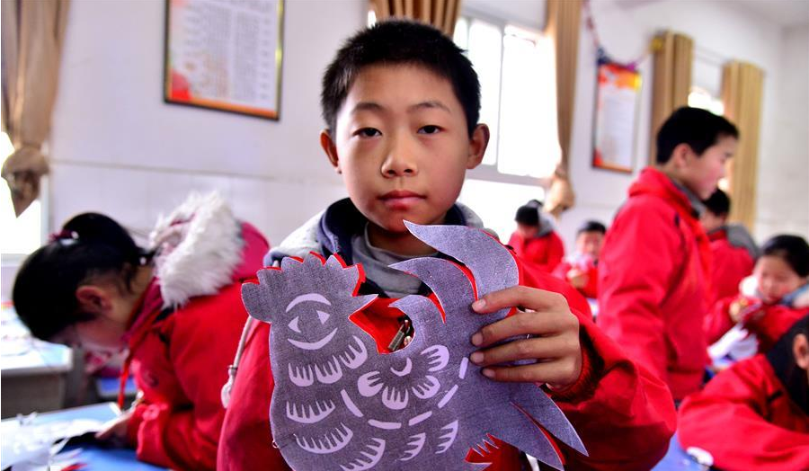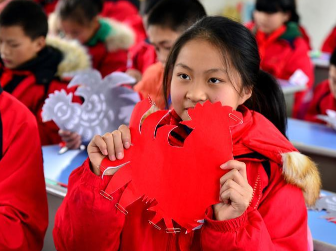 2017年2月21日,湖北十堰市郧阳区城关镇第一完全小学五一班的学生在校外辅导员传统剪纸爱好者戴正英女士的辅导下正在学习剪纸,独臂少年右肢残疾12岁的张彬同学独自完成作品。