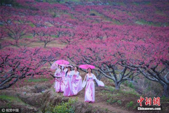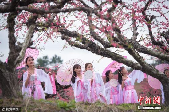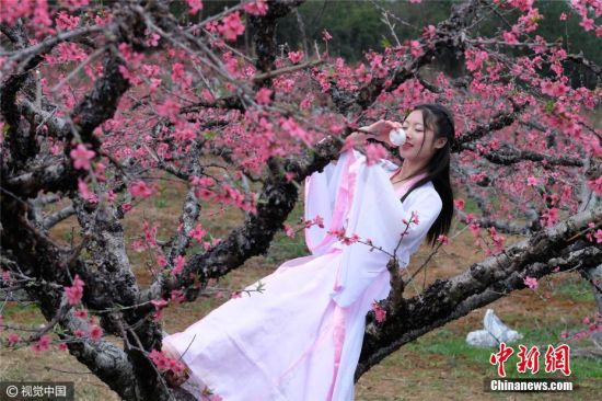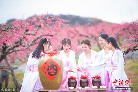 2月25日,广东连州2017年桃花节开幕,身穿古装的窈窕少女,像古人一样踏青赏花、吟诗作对。在桃花林里摆下桌子,倒满桃花酒,一边品尝桃花酒,一边玩飞花令,输了的要喝酒。
