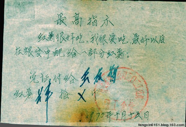“文革”时期,我国普遍将毛泽东主席的话称为“最高指示”。但象“红薯很好吃,我很爱吃”这样的最高指示并不多。当时许多文字表述的文件、图书、报刊、票证上都印有“最高指示”,把这条最高指示印在红薯票上,当然最贴切了。