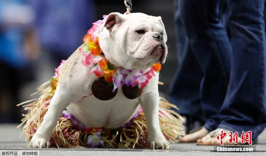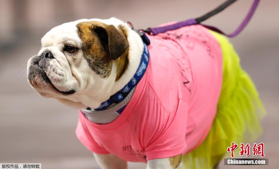 当地时间4月23日,美国爱荷华州德雷克大学了举行斗牛犬选美大赛。38只憨态可掬的汪星人盛装参赛,争夺最美斗牛犬头衔。图为名为Roxie的斗牛犬穿上粉色服装,参加选美比赛。