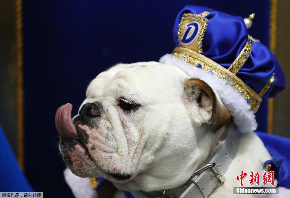 在今年的比赛中,两岁半大的斗牛犬“普鲁登斯”(Prudence)脱颖而出,成为年度“最美斗牛犬”。图为Prudence头戴皇冠,登上“王座”。