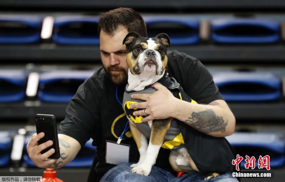 带着爱犬Charlie来参赛的Erin Carlo拿出手机,与自己的爱宠合影。