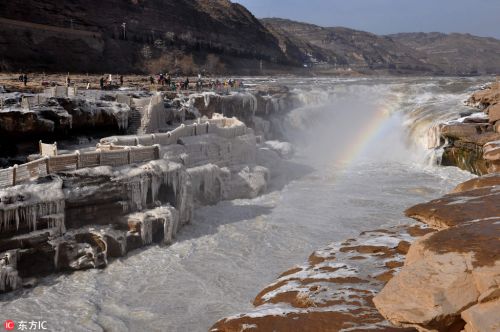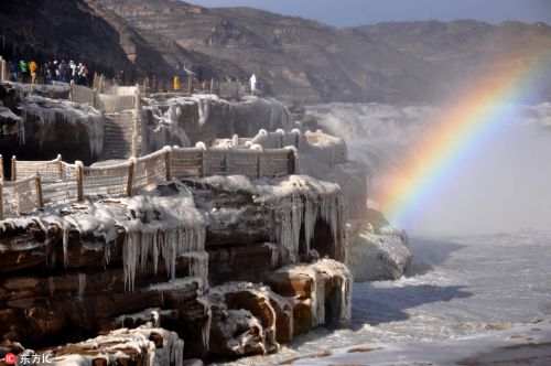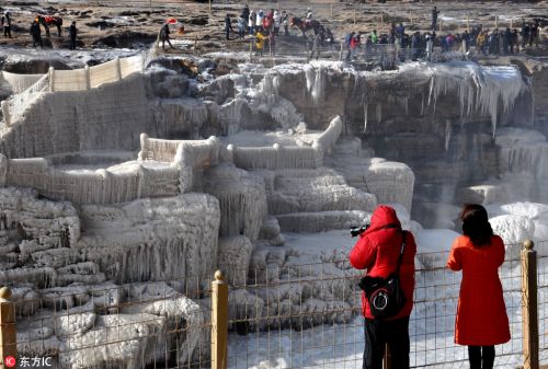 2017年12月11日,在山西吉县黄河壶口瀑布拍摄的冰瀑景观。近日,受持续降温天气影响,山西吉县黄河壶口瀑布出现流凌冰挂景观,瀑布下游的十里龙槽已完全被冰凌覆盖。