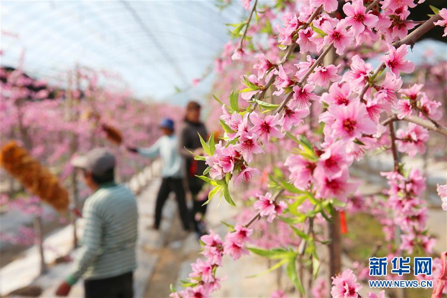 3月13日,农民在江苏省南通市通州区十总镇双墩村现代果蔬园大棚里为桃花授粉。 新华社发