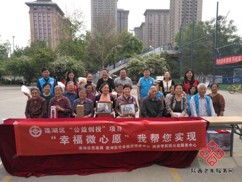 为帮助社区群众解决实际困难,实现他们心中的愿望,沣惠北路社区携手陕西零贰玖公益服务中心在本次活动现场开展孝亲助老"微心愿"活动,帮助困难群众特别是贫困家庭、空巢老人、低保对象、残障人士等实现"微心愿"。此次活动社区通过走访困难群众填写心愿卡、服务大厅设立许愿窗口等多种形式,共征集到30个"微心愿",所有心愿在活动现场全部实现。