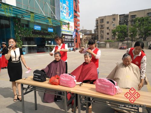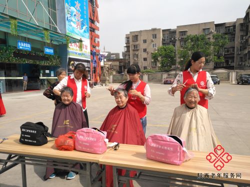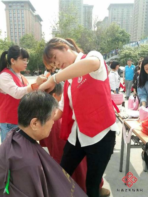西安兰梦理发培训学校的学生们专门到活动现场义务为老年人理发