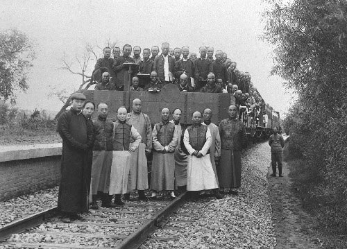 京张铁路修成时詹天佑(车前右第三人)和同事的合影。新华社发