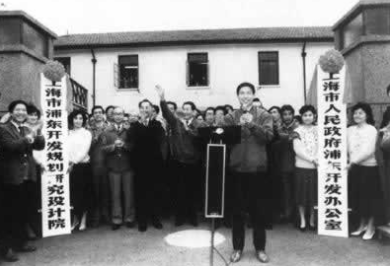 上海市人民政府浦东开发办公室和浦东开发规划研究设计院正式挂牌,举手致意者为中共上海市委书记、上海市市长朱榕基1990年4月18日,国务院总理李鹏在上海宣布:中共中央、国务院同意上海市加快浦东地区的开发,在浦东实行经济技术开发区和某些经济特区的政策。
