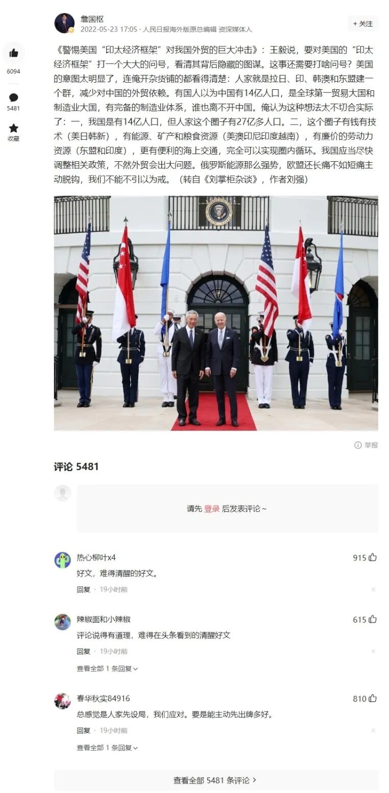 昨天,《今日头条》发表俺大学同学、人民日报海外版原总编辑詹国枢的转文《警惕美国”印太经济框架“对我国外贸的巨大冲击》,詹总节选了俺昨日杂谈相关部分,加了标题。刚才看了一下,该文点击量已超70万次,有5000多评论、6000多点赞。感谢詹师兄推荐转发,感谢网友抬爱。