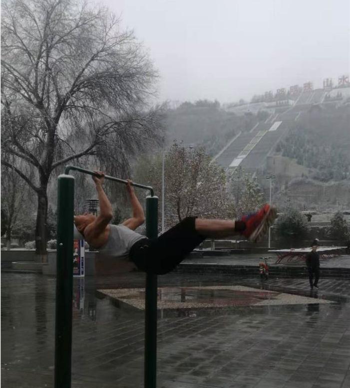 咸阳七旬“健身达人”冬天短裤背心翻单杠 十年锻炼风雨无阻