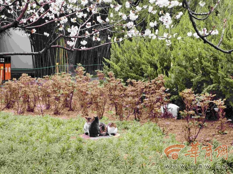 在一棵开得特别繁茂的樱花树下,草丛里卧着6只可爱的小猫,引来不少市民。有的市民在投喂食物,吃饱后,因为天冷,几只小猫聚集在井盖上报团取暖,游客们纷纷驻足拍照。