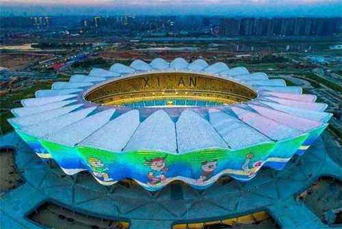 奥体中心的下方以永宁门为主元素,用以纪念5届西马的起点。左右两边的大雁塔和钟楼则代表了西安璀璨的历史文化。